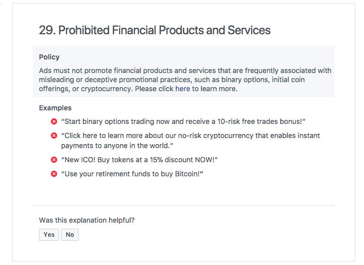 如图所示,上述新政策就是禁止与加密货币相关的所有广告——不仅仅是打压那些直接尝试销售加密货币或加密代币,因此,比特币钱包之类的广告也将被禁止,包括以太币在内的其它挖矿硬件等相关的广告也会被 Facebook 禁止。