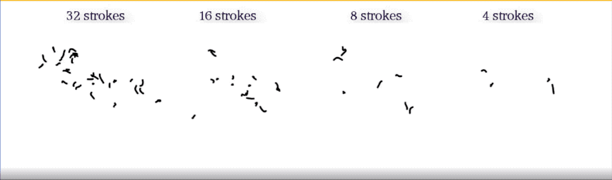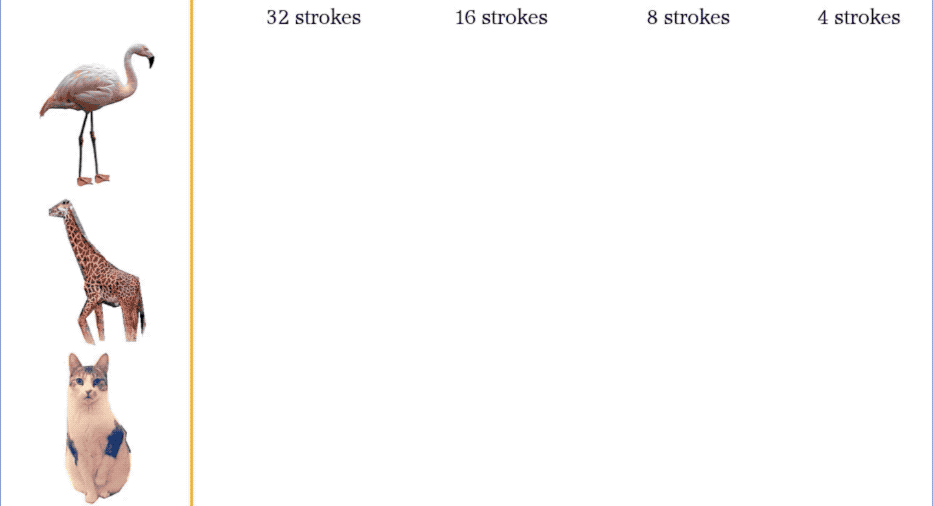 从32笔到4笔,即使大量信息都抽象略去了,但我们还是能辨识出对应动物,尤其是最下面的猫猫,只需4笔曲线也能展示出猫的神韵:
