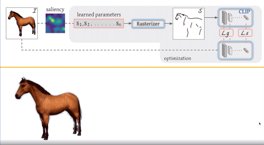 例如我们要画一匹马,首先通过特征图(saliency)标记一些初始线条(S1,S2…Sn)的位置。