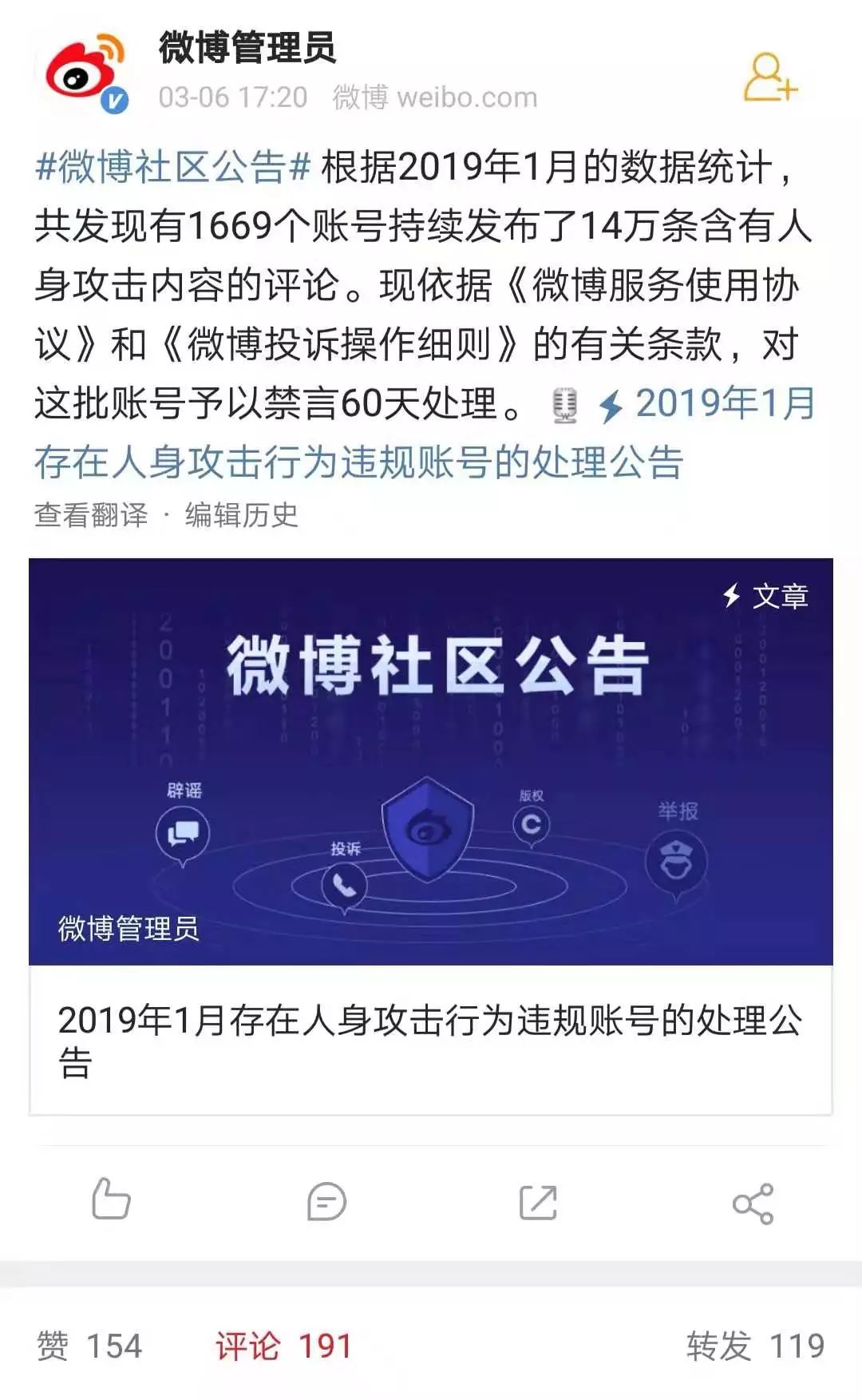 新榜讯 3月6日,微博官方@微博管理员 发布公告表示,根据2019年1月的数据统计,共发现有1669个账号持续发布了14万条含有人身攻击内容的评论。现已对存在恶意人身攻击行为的违规账号予以禁言60天的处理。