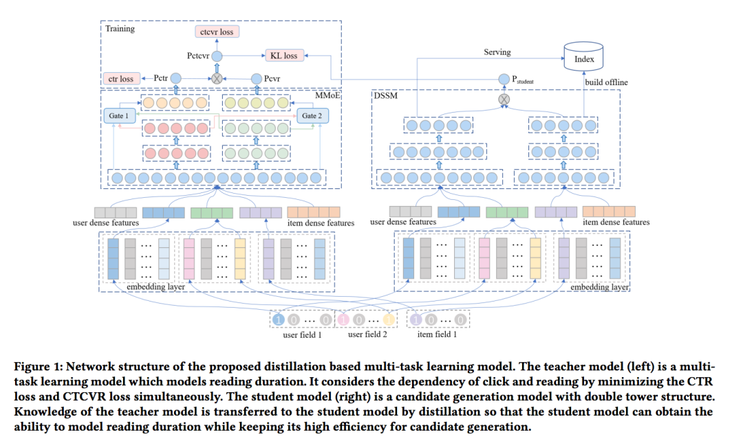 这篇论文中,作者提出了基于蒸馏的多任务学习框架来建模阅读duration来进行召回。其中阅读时长和点击模型的融合方式有一定借鉴意义,召回蒸馏精排的方式也是一种通用的全链路一致性建模方式。