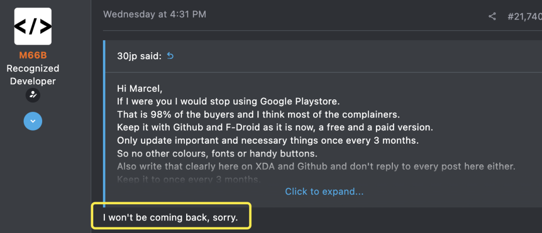 “一怒之下”,Bokhorst 决定从 Google Play 商店中撤下 FairEmail 和他的所有其他应用程序。尽管有不少人试图劝解,但 Bokhorst 态度坚决,他表示,“我真的很感谢所有的好话和关心,但我仍然没有找到一个很好的答案来回答为什么我应该继续这些项目。在很长一段时间里,我觉得自己是谷歌和所有那些不停地提出要求和评判别人的人的奴隶,现在我感到了一种解放。”