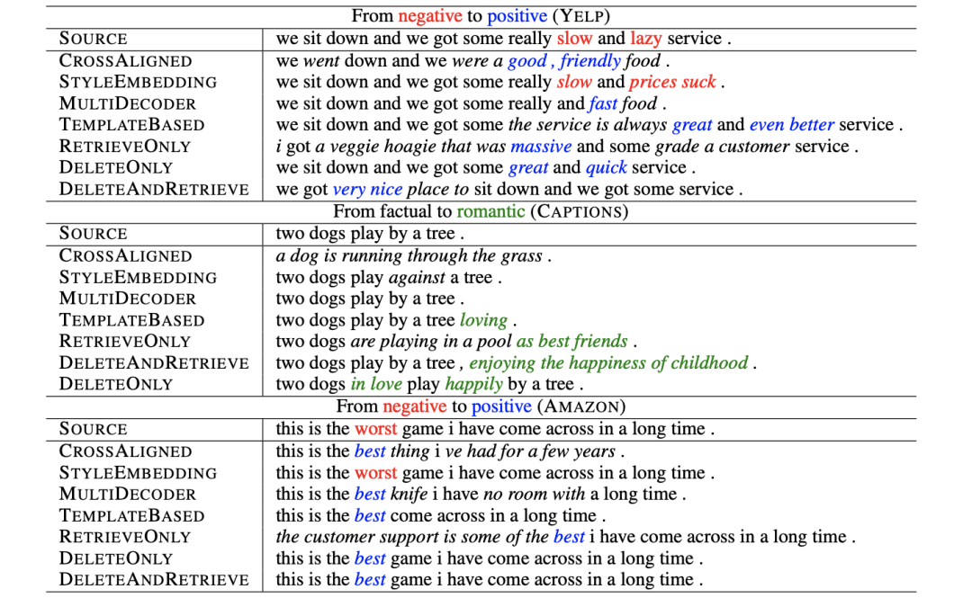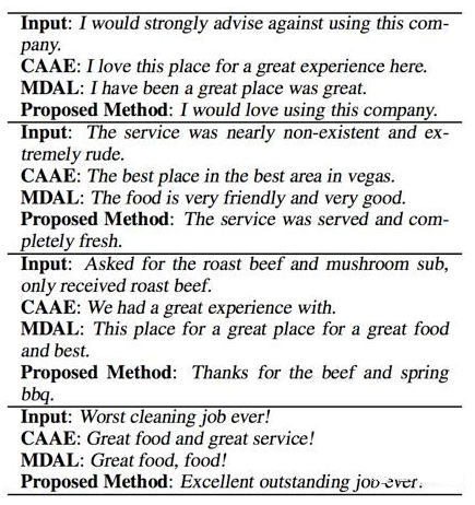 但是也可以看到,这篇工作提出的方法在大幅提高 BLEU 的情况下,ACC 也有一定损失。可以从这个结果看到,想要非常自然地融入 sentiment words 并且不破坏语义和语法,是很困难的事情。看一些直观的转换结果: