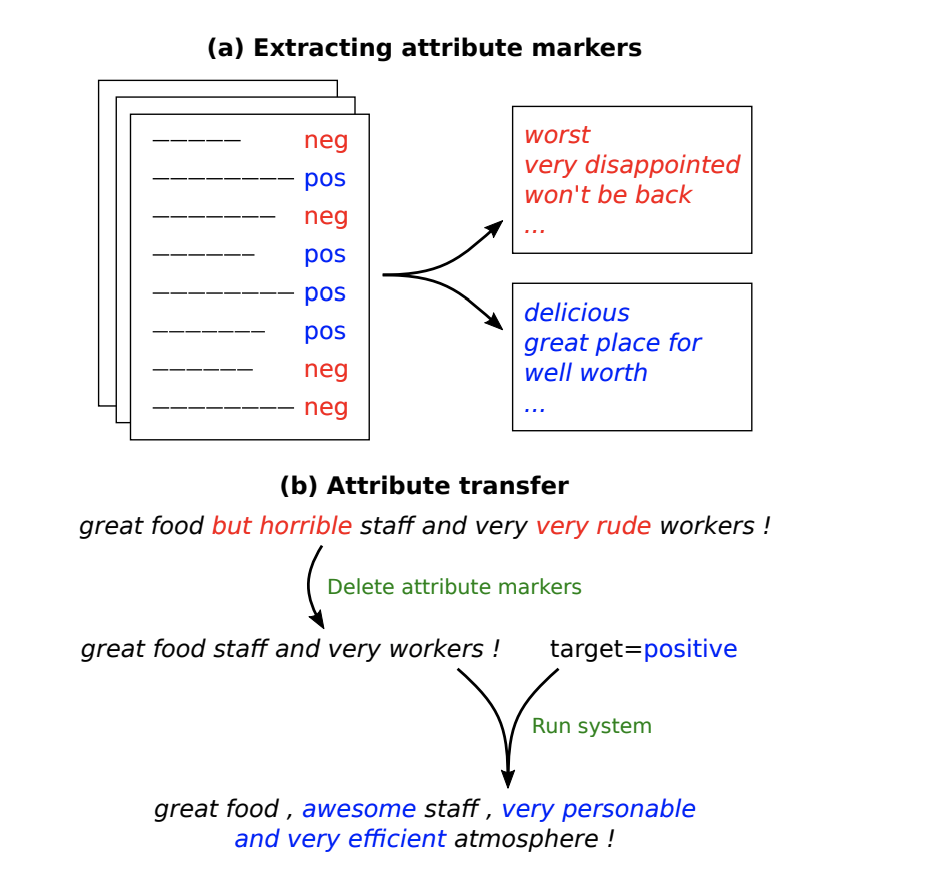 第二篇论文,几乎也是一样的思路。但是在具体实现上要更直接一点。第二篇论文在进行 style transfer 的时候,基于的是这样的假设:文本的一些属性(attribute),比如文本传达出来的情感信息等,可以体现在文本中的某些特定词汇上。通过改变这些词汇,就可能直接改变整句文本的性质属性(value)。