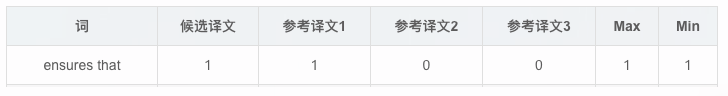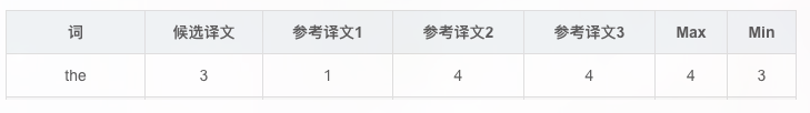 首先统计候选译文里每个词出现的次数,然后统计每个词在参考译文中出现的次数,Max表示3个参考译文中的最大值,Min表示候选译文和参考译文中的最大值的最小值。例如,词"the":