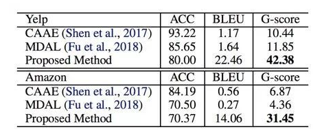 从实验结果来看,过去的工作主要都只考虑了 style transfer 的成功与否(sentiment accuracy),而没有显性地考虑 content perserving,所以确实在 BLEU 指标下表现很差。