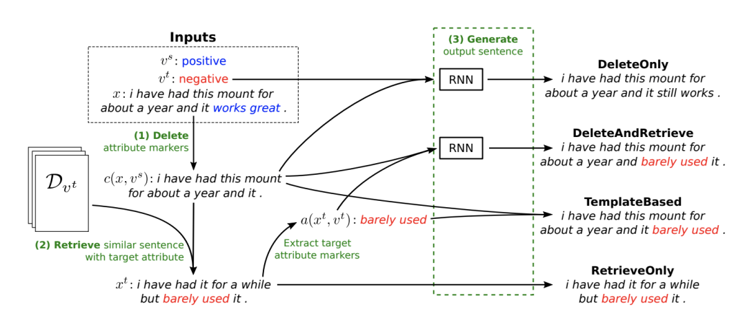 由上面的示意图可以看出,作者将那些具有指示功能的特定词称为 attribute marker,通过(主要)改变这些 marker,进行 attribute transfer。文章进一步提出了4种具体的方法来改变 marker。