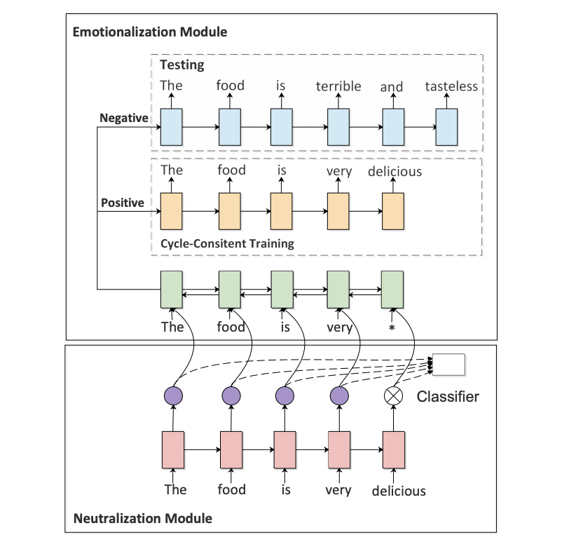 为了解决这个问题,这篇工作使用了两个 module,一个 neutralization module 用于提取 non-emotional content,另一个 emotionalization module 用于生成或者说融入 sentiment words。