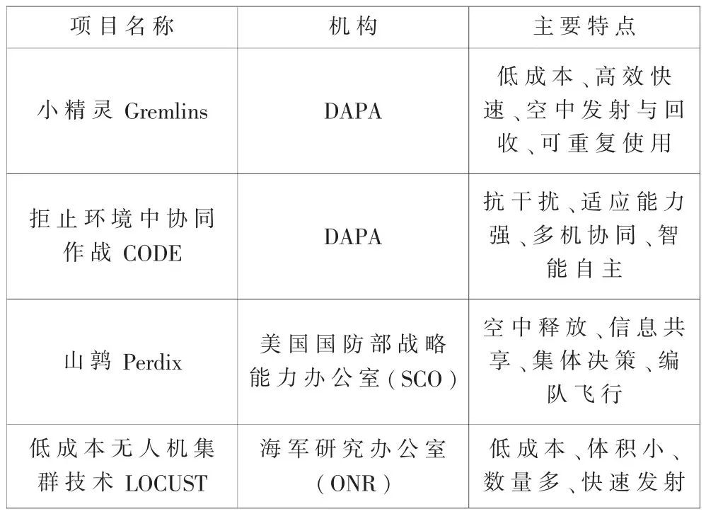 通过单体之间的紧密协作,体现智能无人机集群体作战性能的优越性,世界各国均致力开展智能无人机集群的研究,已经成为无人机领域的一个重要发展方向。美国通过国防高级研究局 (Defense Advanced Research Projects Agency,DARPA)和海军研究实验室(United States Naval Research Laborator,NRL)等机构全力探究无人机集群最新技术,应用于军事发展,以保证其全球军事技术领先。目前典型的无人机集群技术有:小精灵(Gremlins)项目、拒止环境中协同作战项目(CODE)、“山鹑”(Perdix)微型无人机项目、低成本无人机集群技术项目(LOCUST)等[5-7],其主要特点如表1所示。
