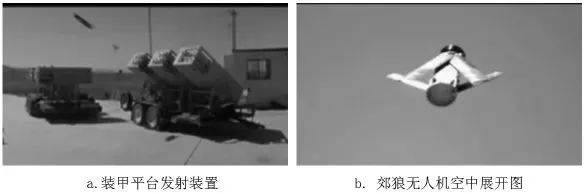 2015年4月美国海军研究办公室公布了关于低成本无人机集群技术(Low-Cost UAV Swarming Technology,LOCUST)项目的研究状况,海军于2016年4月实现了30架郊狼无人机的快速发射和完全自主编队飞行技术验证。该项目旨在快速发释放大量小型无人机,通过自适应组网及自主协同技术,携带各类侦查与攻击载荷,在数量上以绝对压倒性的优势赢得战争。LOCUST项目发展了如郊狼等一系列小型折叠翼无人机和多管发射装置,这类装置可以装备到装甲车、飞机、舰船等平台上,并实现1架每秒的速度释放出无人机集群,如图2所示。