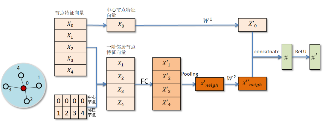先对中心节点的邻居节点表示向量进行一次非线性变换,然后对变换后的邻居表示向量进行池化操作(mean pooling或者max pooling),最后将pooling所得结果与中心节点的特征表示分别进行非线性变换,并将所得结果进行拼接或者相加从而得到中心节点在该层的向量表示。