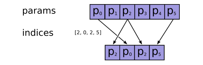 tf.gather:https://www.tensorflow.org/api_docs/python/tf/gather