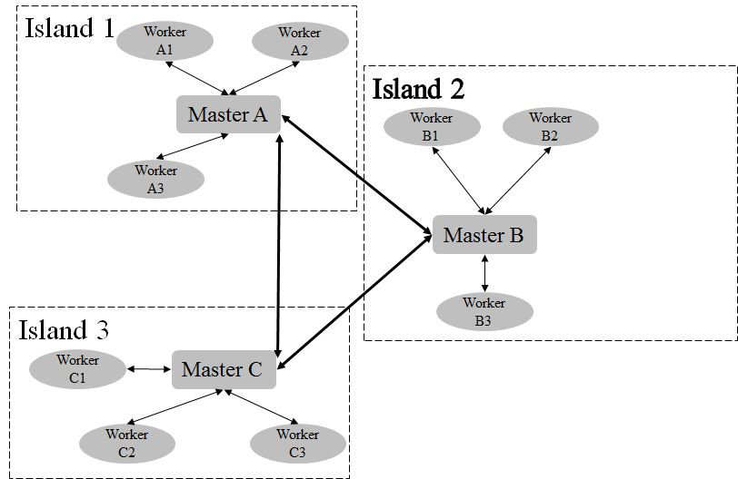 Population Island的算法架构如图3所示。在算法执行过程中,有若干个Island并行执行计算,每个Island独立地进行演化,其中各有一个Master和若干Worker,其中Worker负责具体的搜索任务的计算执行,Master负责任务的分配协调以及与其它Island之间的通信等。每隔一定的计算步数,各个Island的Master之间会相同通信,分享搜索过程中获得的知识,从而提升整体的搜索效率。