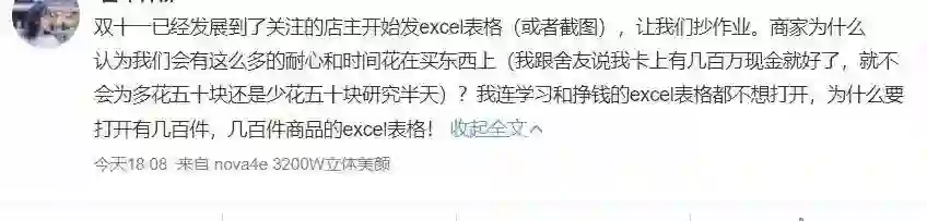 “双十一已经发展到了关注的店主开始发excel表格,让我们抄作业。商家为什么认为我们会有这么多的耐心和时间花在买东西上?我连学习和挣钱的excel表格都不想打开,为什么要打开有几百件商品的Excel表格!”