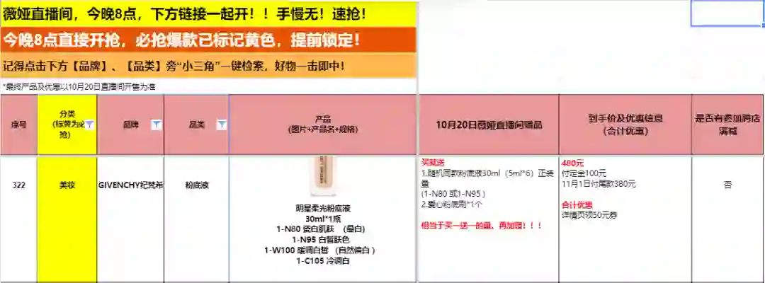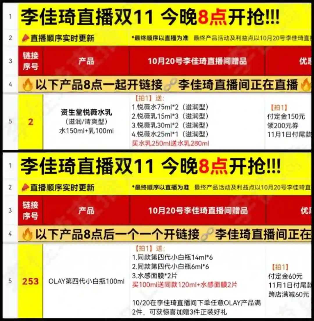 具体到工作表,首行一致,均是“XX怎么买”“10月20号下午X点,李佳琦直播间冲”。