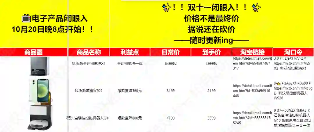 电子产品、美妆护肤、天猫超市,每条细分类别下,有几十条到几百条不等的产品信息,大至酒旅套餐、车,小到一盒牙膏,都会标好日常价、双11到手价、商品链接,甚至还贴心放置有商品图。