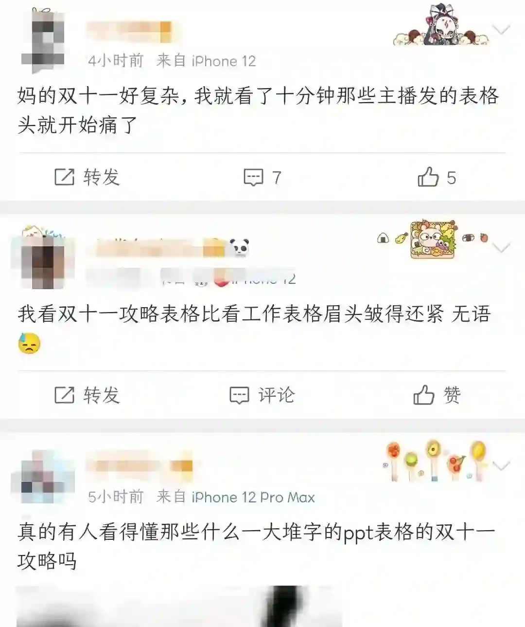 有吐槽表格形式型,“我看双十一攻略表格比看工作表格眉头皱的还紧”“上班表格,下班表格,双十一什么时候能从这世上消失”……