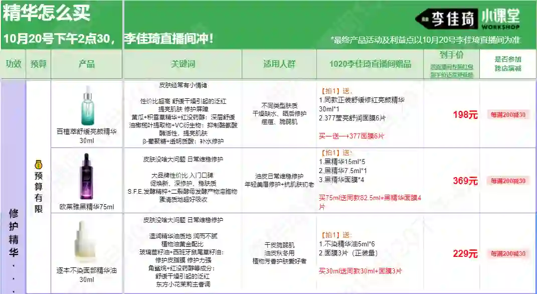 同时,工作表还详细列举了大家比较关心的预算、产品的价格、类型、功效、主要成分、关键词、适用人群、直播间赠品、到手价以及是否参加跨店满减。