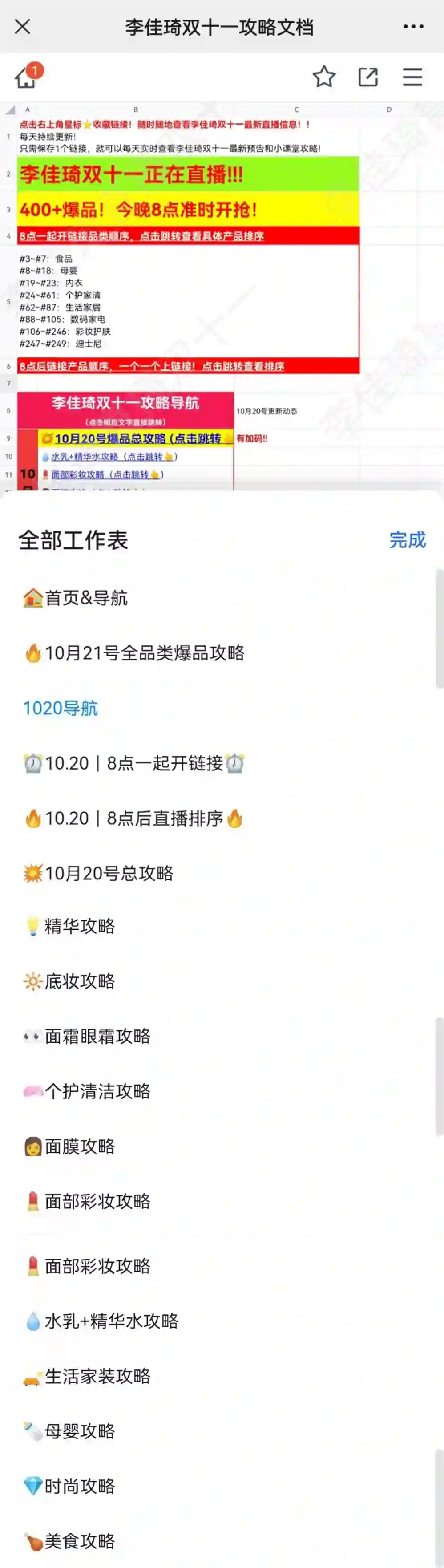 文档一共创建了16个Sheet工作表,包括首页/导航、1020导航、10.20 | 8点一起开链接、10.20 | 8点后直播顺序、10月20号总攻略以及各个产品品类的攻略等,且表格一直在持续更新。