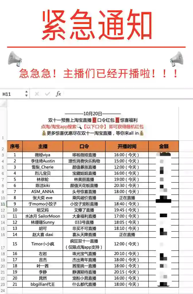 “【内部资料】飞猪双11官方爆款清单”“叮!薇娅直播间10月20日爆品排序来了”“李佳琦双十一攻略文档”……不仅一些官方平台做了表格,甚至连宣传海报都做成了Excel的形状。