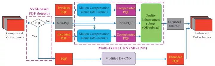 再将补偿后的两个PQF与当前的non-PQF一起输入质量增强子网络(QE-subnet),最终即可得到质量增强后的当前non-PQF。