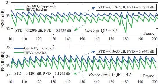本文提出的MFQE算法在测试视频上的质量提升效果(PSNR提升)如表 3 所示。可以看出,本文的MFQE算法的质量增强性能明显好于原有的最新对比算法。图 5 和图 6 分别展示了MFQE算法在PQF、non-PQF和VQF(峰谷质量帧)上的质量提升效果以及使用MFQE算法提升质量后帧间质量波动情况。