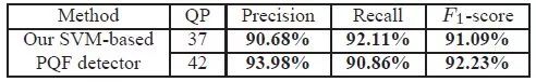 由于有损压缩后的视频观看时无法获取原视频,无法在质量增强前获得每帧的PSNR值。因此,首先需要研究一种无参考的PQF检测算法。考虑到PQF是相对于相邻帧质量较好的帧这一定义,本文将当前帧和相邻四帧(共 5 帧)均使用 [Mittal et al. 2012. No-reference image quality assessment in the spatial domain.] 中提出的无参考质量评估方法提取出特征,并将 5 帧所有特征放入 SVM 分类器训练,最终预测出当前帧是否是 PQF。该方法预测PQF准确度很高,在HEVC压缩视频中的准确率如表 2 所示。