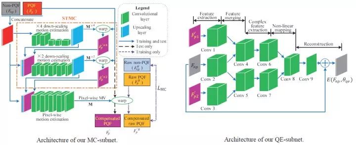 对于PQF,由于周围没有质量更好的帧,所以仅使用单帧质量方法DS-CNN对其进行质量增强。MC- 和 QE-subnet 的网络结构图如图 4 所示。由于MC- 和 QE-subnet 均为深度学习网络,所以两个网络可以进行端到端的联合训练。