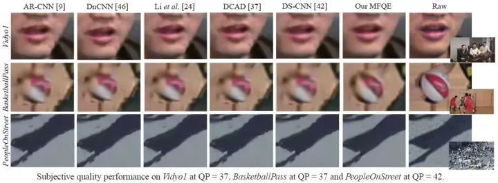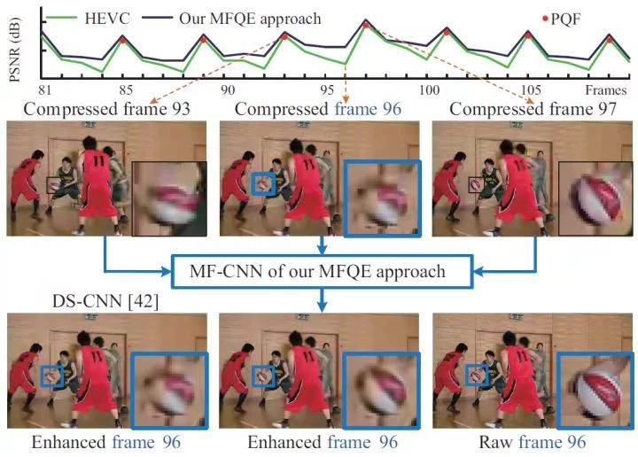 当处理第96帧(non-PQF)时,将其相邻的PQF(质量更好的帧)与其一同输入本文提出的MFQE方法,第96帧(non-PQF)的质量(如篮球)即可被显著增强。这是由于充分利用了相邻的PQF中的相似内容。