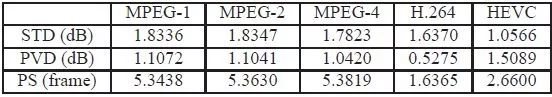 表1 不同压缩标准视频的平均质量标准差、峰谷差和峰间距。