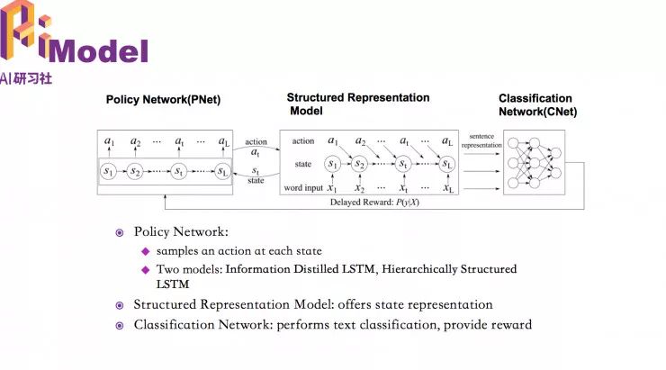 这个任务同样可以建模为强化学习问题,用强化学习的思想来解。同样的,在这个任务中的 reward 也是有延迟的,因为需要把整个结构都学到后,才能得到句子的表示,才能用句子的表示做分类,中间的过程是不知道这个结构是好的还是不好的。
