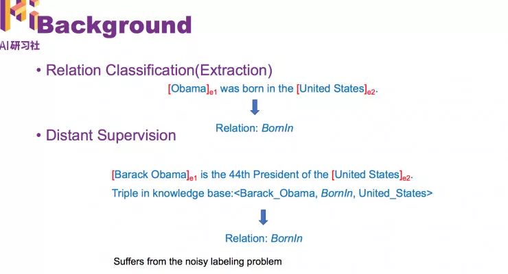 之前也有人提出 Distant Supervision 方法,希望能利用已有资源对句子自动打上标签,使得得到更大的数据集。但这种方法是基于已有知识图谱中的实体关系来对一句话的实体关系进行预测,它的标注未必正确。