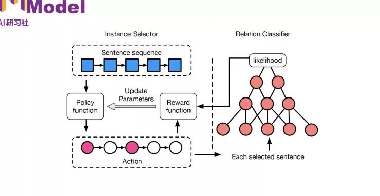 基于以上不足,我们设定了新模型。包括两个部分: Instance Selector 和 Relation Calssifier。