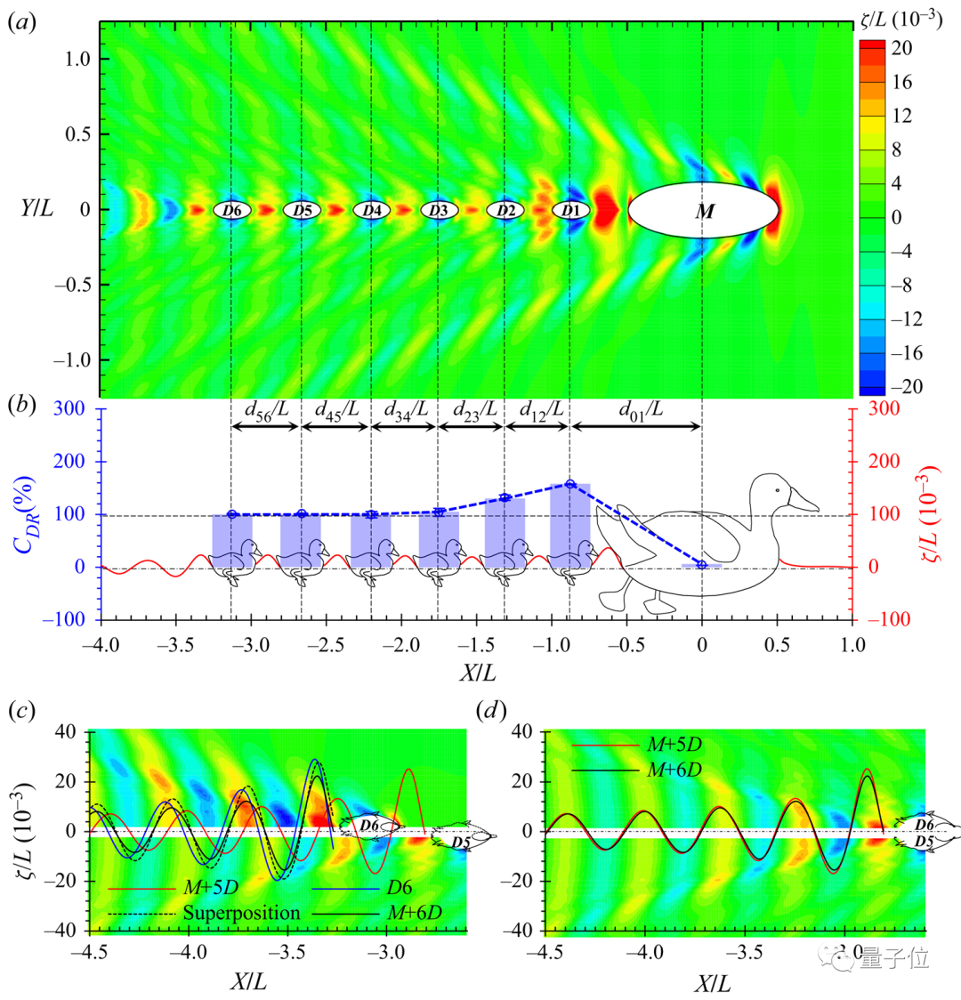 研究建立了一个数学模型,来计算一群鸭子在列队划水时遇到的阻力。结果发现,如果小鸭子乘坐在母鸭划水产生的波上,阻力就会大大减少。