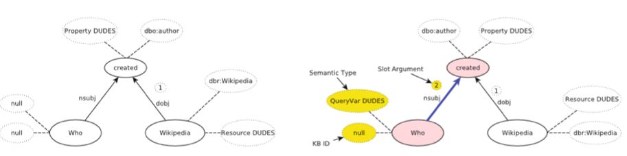 1. 输入问句为“Who created Wikipedia”,首先得到对应的依存解析树
