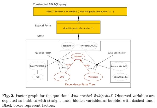 本文主要关注基于RDF数据的多语言问答任务中,对不同语言问句的语义分析工作。作者提出一种基于DUDES(Dependency-based Underspecified Discourse Representation Structures)的因子图推理方法,对多语言问句中的词进行角色定义和识别,并根据获取到的语义解析结果,规则生成问题的SPARQL。文中表示,使用因子图进行推理对语言类型的敏感程度较低,是一种有效的多语言语义解析方法。模型的性能评测基于QALD-6发布的英语,德语以及西班牙语数据。