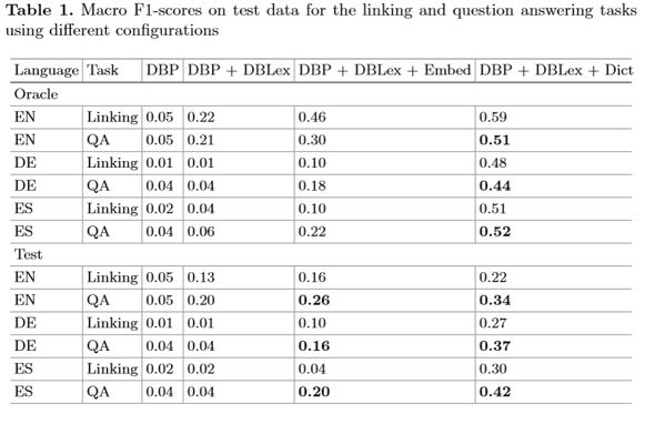 对于问题语言与知识库不相同的案例,作者提出的处理方式是利用多语言词典 Dict.cc 的词级别翻译配合 word embedding 检索找到知识库中可能的目标实体。
