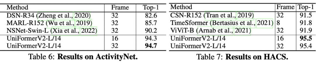 在长时行为数据集 ActivityNet 和 HACS 上,UniFormerV2 以显著的优势高于先前的 SOTA 方法。