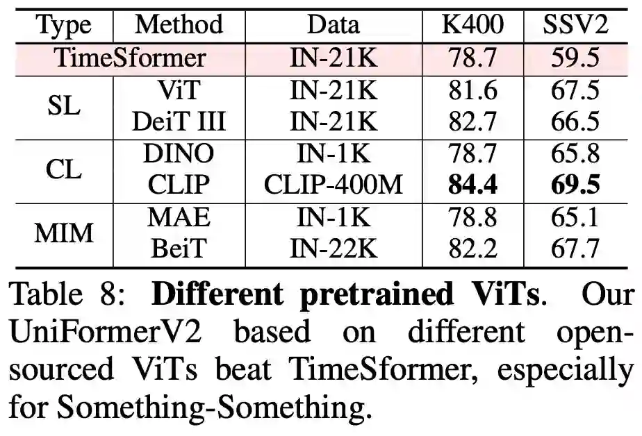 我们对有监督预训练、对比学习、掩码学习的预训练 ViT 都进行了适配验证,可以看到即便使用 ImageNet-1K 预训练的 ViT,我们的方法都能优于 TimeSformer,尤其是在 Sth-Sth 这类强时序相关数据集上。另外一个有趣的观察时,