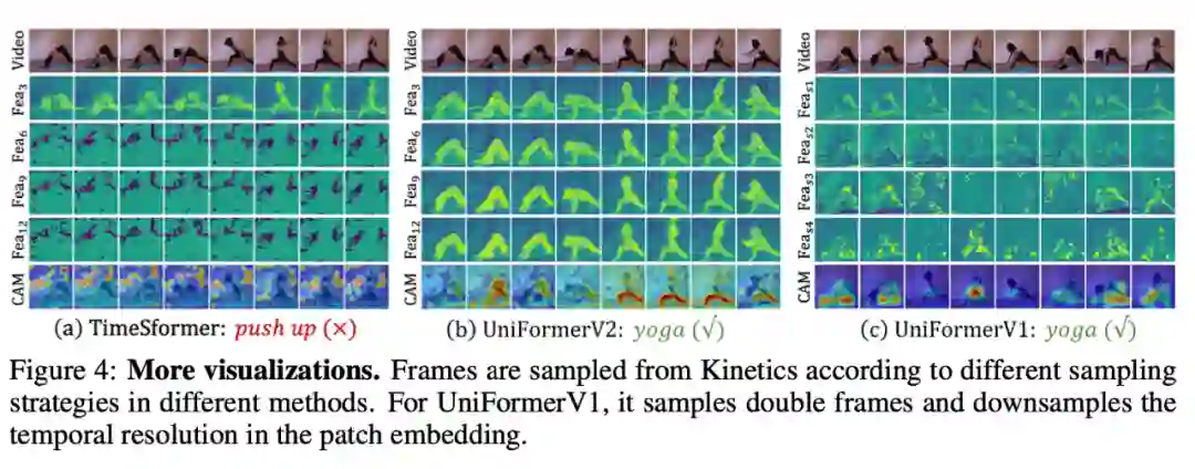 可视化特征可以发现,UniFormerV2 能更好地在浅层和深层保留特征的细节,并关注前景区域。