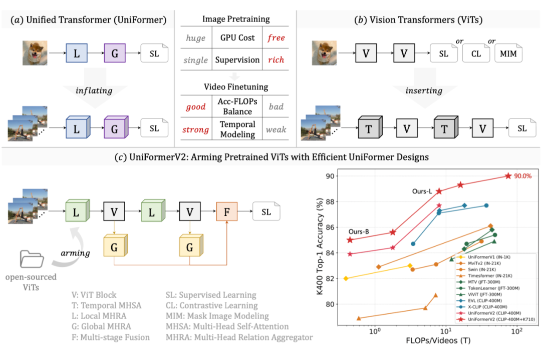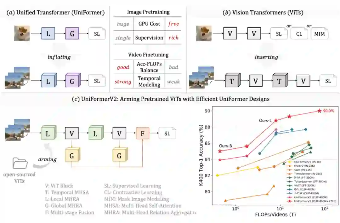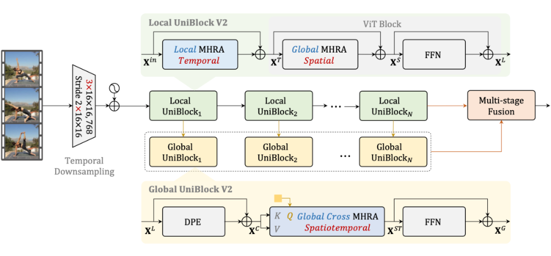 UniFormerV2 也便是在这种想法下产生,我们沿用了 UniFormerV1 中的结构设计思想,设计了高效的局部与全局时空学习模块,可无缝插入到强预训练的图像 ViT 中,实现强大的视频建模。