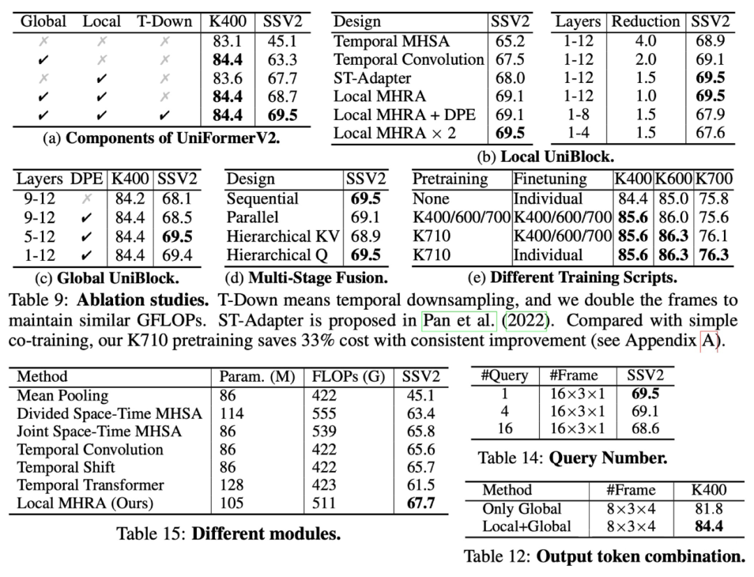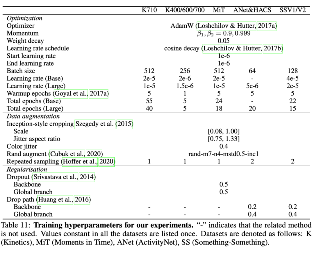 训练超参数:对强预训练模型,在视频任务上进行 full-tuning 迁移,需要使用较小的学习率,并且在数据规模较小是,需要引入额外的正则化如 droppath 等,具体超参可看原文附录 Table11。