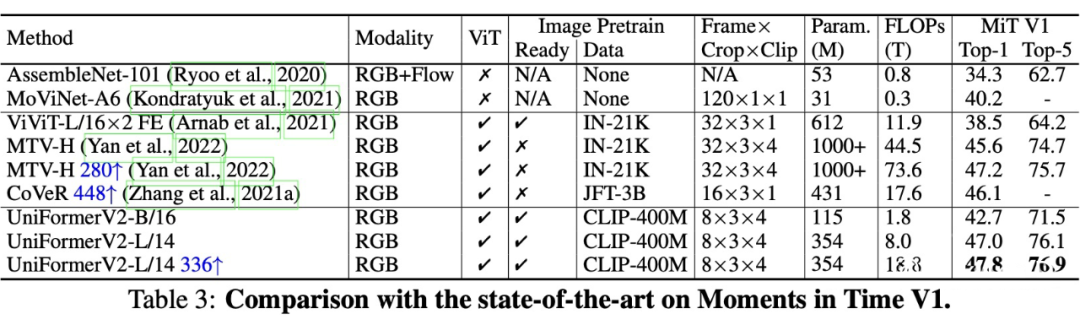 对 MiT 这种类内类间差异更大的行为,UniFormerV2 同样取得了最佳的性能