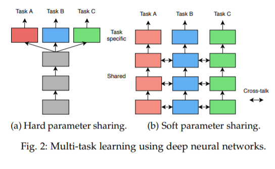 在深度学习时代,MTL转化为能够从多任务监控信号中学习共享表示的网络设计。与单任务情况下,每个单独的任务由自己的网络单独解决相比,这种多任务网络理论上给表带来了几个优点。首先,由于它们固有的层共享,结果内存占用大大减少。其次,由于他们明确地避免重复计算共享层中的特征,每次都要计算一次,因此他们的推理速度有所提高。最重要的是,如果相关的任务能够分享互补的信息,或者互相调节,它们就有可能提高绩效。对于前者,文献已经为某些对任务提供了证据,如检测和分类[20],[21],检测和分割[2],[22],分割和深度估计[23],[24],而对于后者,最近的努力指向了那个方向[25]。这些工作导致了第一个深度多任务网络的发展,历史上分为软或硬参数共享技术。