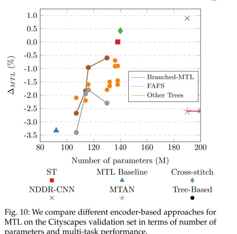 其次,当使用单一MTL模型处理多个密集预测任务时,基于解码器的架构目前在多任务性能方面提供了更多优势,与基于编码器的架构相比,其计算开销有限。如前所述,这是由于基于解码器的体系结构促进了常见的跨任务模式的对齐,这自然很适合密集的预测任务。基于编码器的架构在密集预测任务设置中仍然具有一定的优势,但其固有的层共享似乎更适合处理多个分类任务。