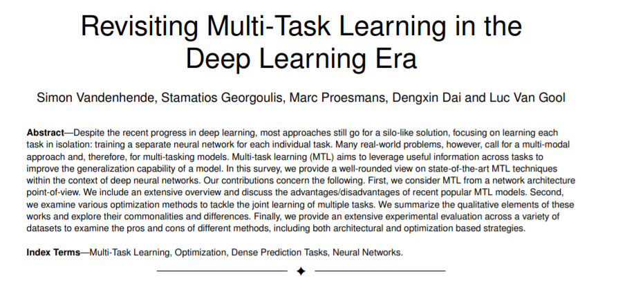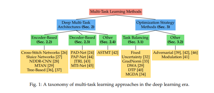 在本文中,我们回顾了在深度神经网络范围内的MTL的最新方法。首先,我们对MTL基于架构和优化的策略进行了广泛的概述。对于每种方法,我们描述了其关键方面,讨论了与相关工作的共性和差异,并提出了可能的优点或缺点。最后,我们对所描述的方法进行了广泛的实验分析,得出了几个关键的发现。我们在下面总结了我们的一些结论,并提出了未来工作的一些可能性。