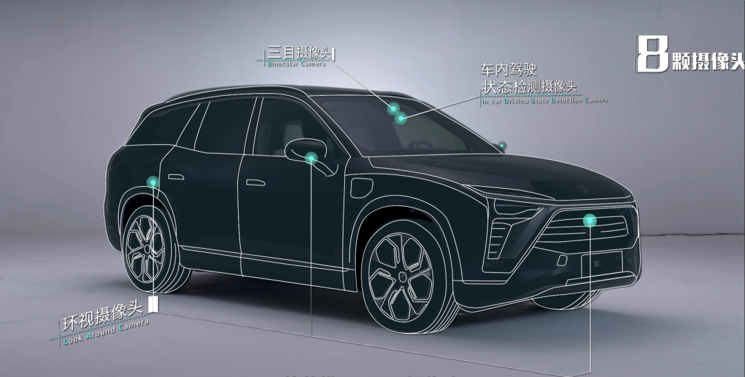 蔚来ES8全车共配备了8颗,分别是位于挡风玻璃上方的三目摄像头、四颗环视摄像头,和一个车内的驾驶状态监测摄像头。