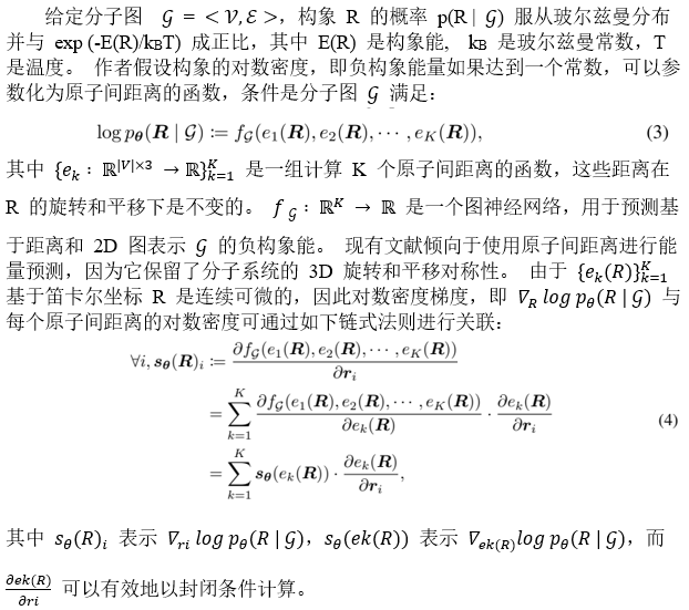 作者的目标是学习原子坐标的对数密度(分数)的梯度,即∇R log p(R | )。使用图神经网络 (GNN) 在绝对笛卡尔坐标上直接参数化评分网络依赖于旋转和平移的选择,这是分子系统中影响构象变化的非必要自由度。因此作者将它们从模型中排除,并首先估计一组动态确定的原子间距离的分数,然后通过到笛卡尔坐标距离的微分来反向传播梯度。