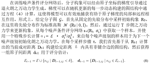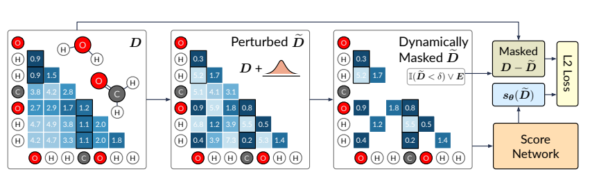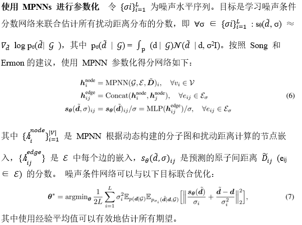 在本节中,作者描述了所提出的原子间距离动态图评分匹配,目的是对局部和远程相互作用进行建模。为了确保学习的评分函数覆盖具有不同图结构的所有区域,在训练期间基于添加的扰动动态构建具有原子之间非键合边的图结构。继 Songand Ermon之后,作者训练了一个噪声条件评分网络来联合估计一组动态确定的原子间距离的扰动分布的分数,并结合消息传递神经网络(MPNN)将分数参数化。