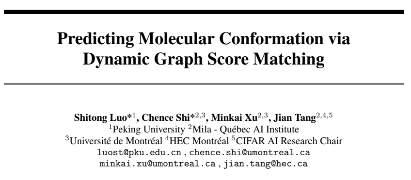 Shitong Luo, Chence Shi, Minkai Xu, Jian Tang. Predicting Molecular Conformation via Dynamic Graph Score Matching。